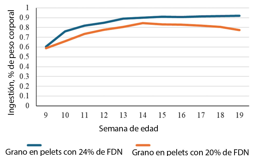 Resultó interesante que la ingestión como porcentaje de peso corporal fue distinta entre el pelet con mayor porcentaje de FDN (24%) en comparación con el de menor porcentaje (20%). Las vaquillas con más FDN en el pelet consumieron el 0.85% de su peso corporal en FDN, mientras que las del otro grupo mostraron un promedio de 0.77%, como se describe en la figura 2.