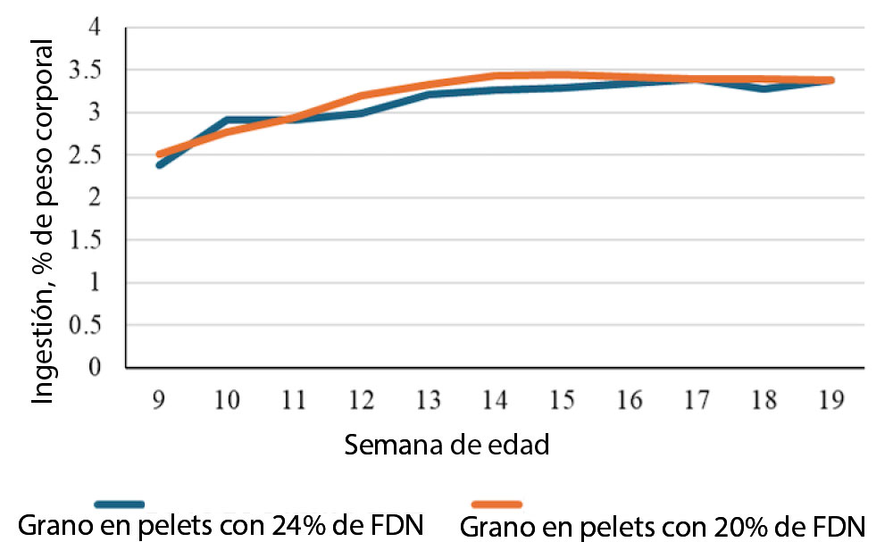 Resultó interesante que la ingestión como porcentaje de peso corporal fue distinta entre el pelet con mayor porcentaje de FDN (24%) en comparación con el de menor porcentaje (20%). Las vaquillas con más FDN en el pelet consumieron el 0.85% de su peso corporal en FDN, mientras que las del otro grupo mostraron un promedio de 0.77%, como se describe en la figura 2.
