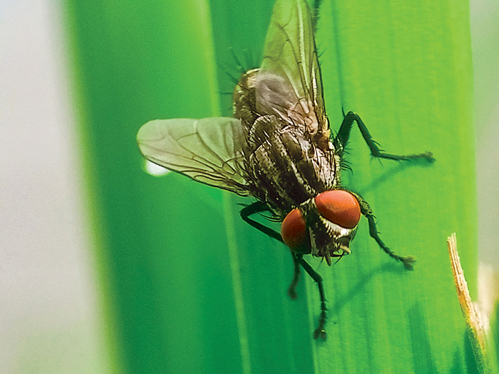 Aunque su tamaño es parecido al de la mosca doméstica y por su apariencia se podría confundir con otros moscardones de tonos azulados, Chochliomya homnivorax presenta un desarrollo distinto, lo que incrementa ampliamente el riesgo que supone para la salud y la economía. Las moscas del gusano barrenador son atraídas por las heridas abiertas de los animales de sangre caliente, incluyendo las lesiones producidas durante el descornado, castración, perforación para aretes y corte del cordón umbilical, además de cortadas, rasguños, picaduras de insectos y garrapatas.
